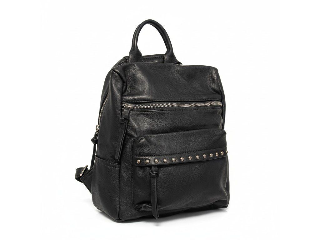Tento elegantní černý batoh představuje ideální spojení funkčnosti a moderního designu. Je vyroben z kvalitního materiálu imitujícího kůži, který mu dodává luxusní vzhled a zároveň zajišťuje snadnou údržbu. Hlavní úložný prostor je dostatečně prostorný pro všechny vaše denní nezbytnosti, zatímco dvě vnější kapsy na zip umožňují přehledné uspořádání menších předmětů, jako jsou klíče, telefon nebo peněženka. Výrazným prvkem je spodní kapsa zdobená řadou stříbrných cvočků, které batohu propůjčují decentně rockový nádech a odlišují ho od běžných modelů.