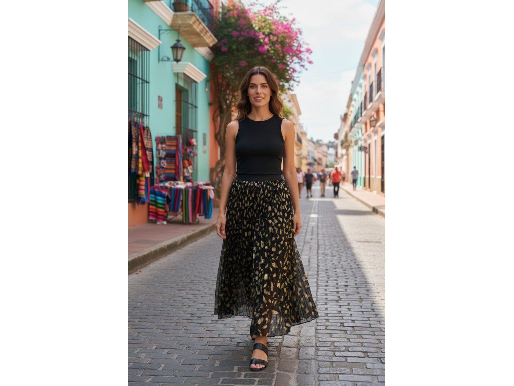 Elegantní černá plisovaná sukně se vzorem je ideální volbou pro ženy, které hledají stylový a zároveň pohodlný kousek do svého šatníku. Díky délce 94 cm a pružnému pasu s rozsahem 64–80 cm se sukně snadno přizpůsobí postavě a poskytuje maximální komfort při nošení. Materiál ze 100% polyesteru zajišťuje lehkost, vzdušnost a jednoduchou údržbu, zatímco plisování dodává sukni jedinečný vzhled a zvýrazňuje ženskou siluetu. Originální vzor na černém podkladu odlišuje tento model od běžných jednobarevných sukní a umožňuje snadné kombinování s různými topy i doplňky.