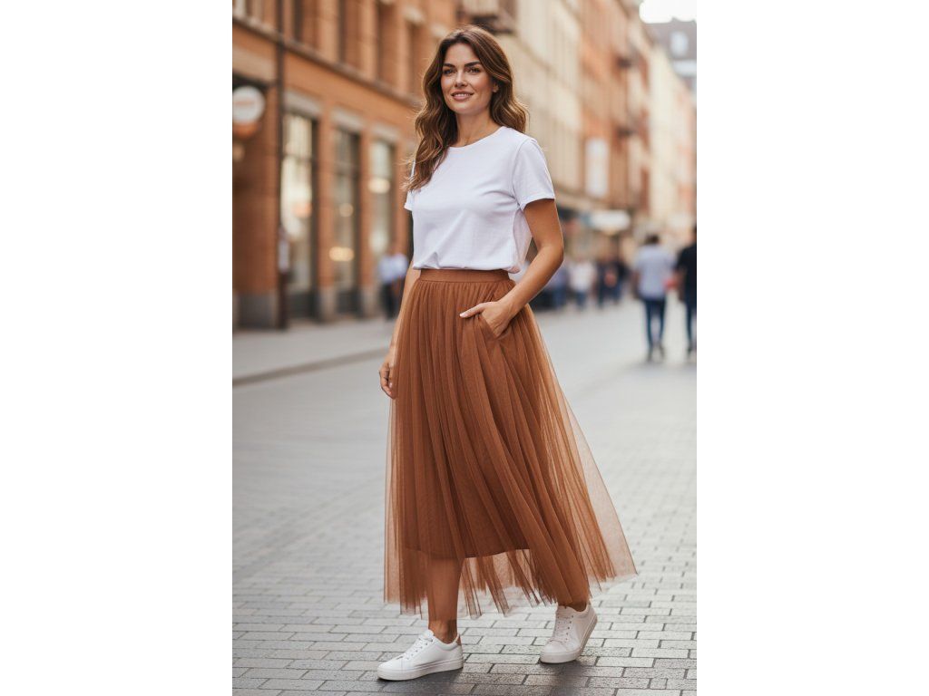 Oranžovohnědá barevná kombinace je originální a snadno se kombinuje s dalšími barvami, což odlišuje tuto sukni od běžných jednobarevných modelů. Sukně je vhodná do práce, na společenské události i volnočasové aktivity, kde oceníte její pohodlí a elegantní vzhled. Nedoporučujeme ji však pro sportovní aktivity nebo do extrémních povětrnostních podmínek, kde by mohla být méně praktická. Tento model je dostupný ve velikosti S/M/L.